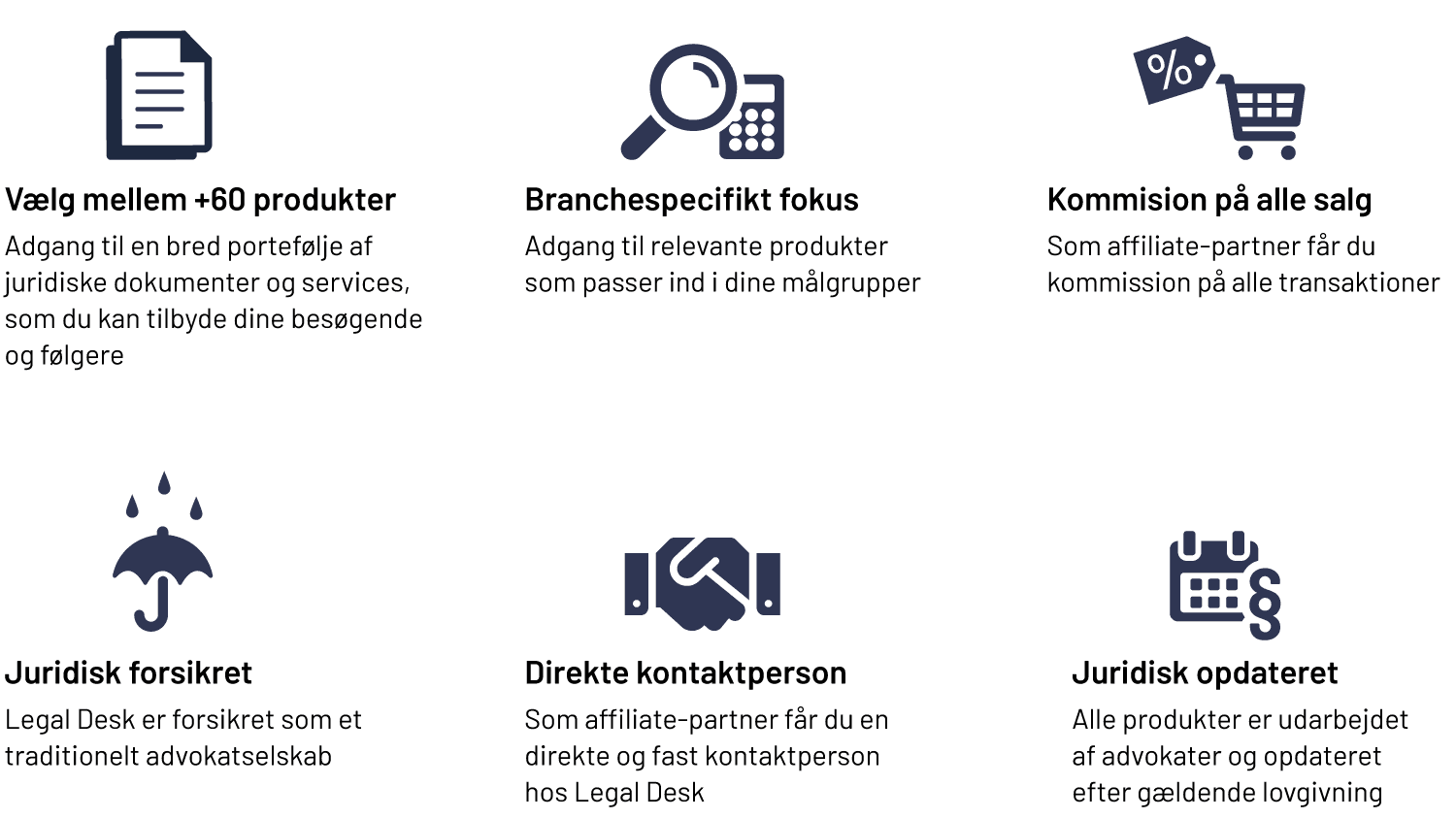 Som Affiliate partner har du adgang til alle Legal Desks produkter, som du kan markedsfører via dine kanaler. Vi sætter en dyd i at være transparente, så når vi tjener penge, tjener du penge.