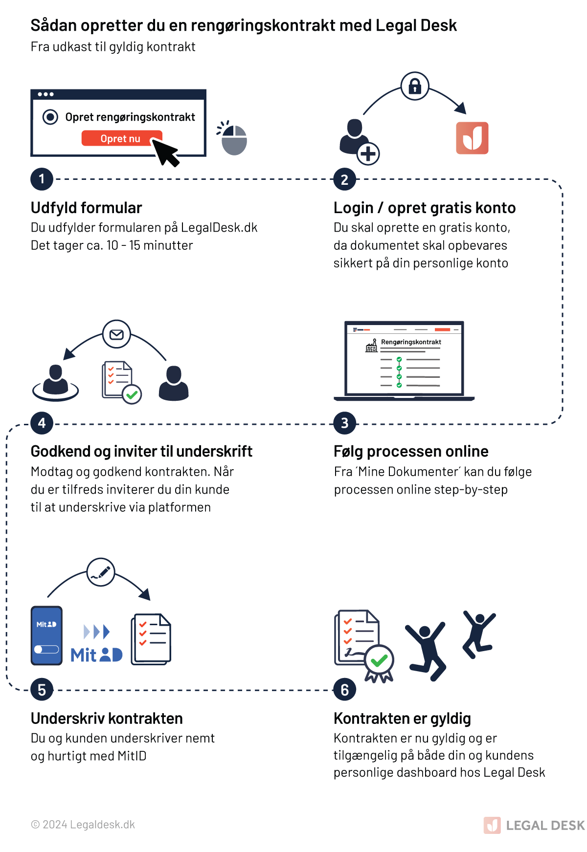 Du kan med Legal Desk nemt og sikkert få styr på dine rengøringskontrakter online. Du skal blot udfylde webformularen, betale for rengøringskontrakten, og dermed vil du modtage den færdige rengøringskontrakt klar til underskrift af aftalens parter, hvilket nemt kan gøres med MitID.