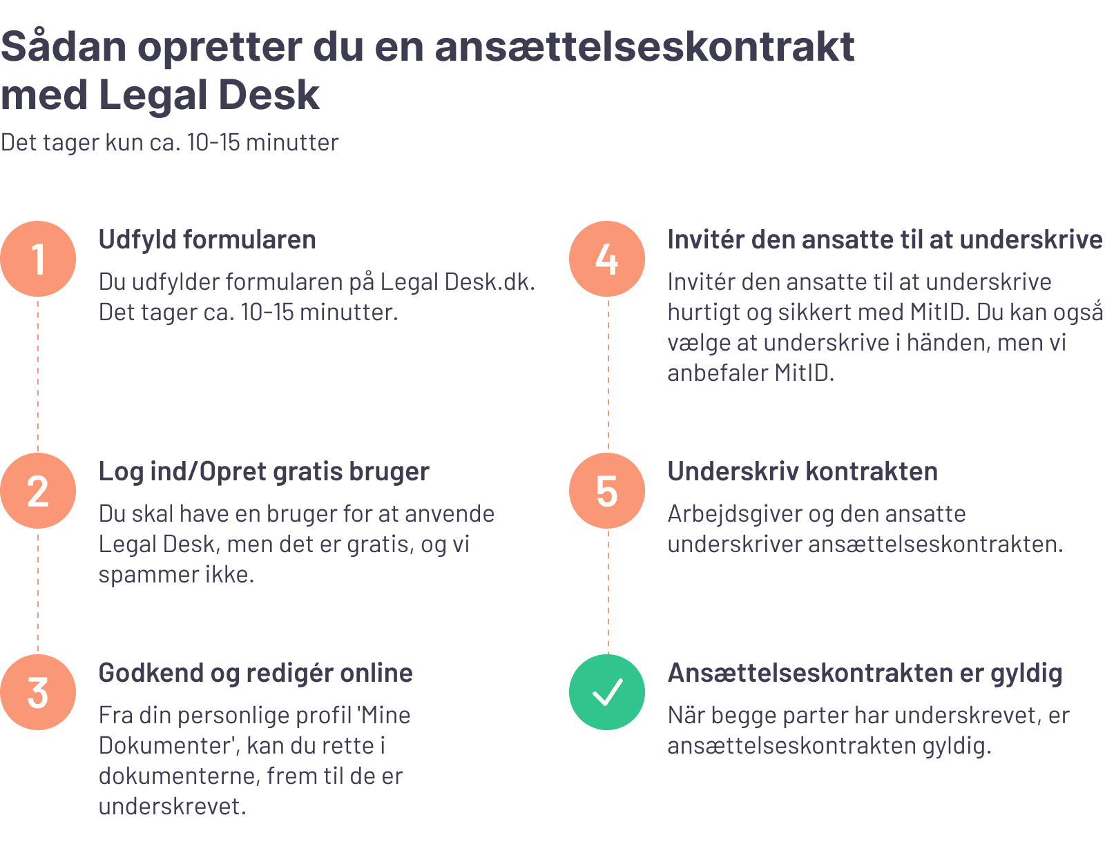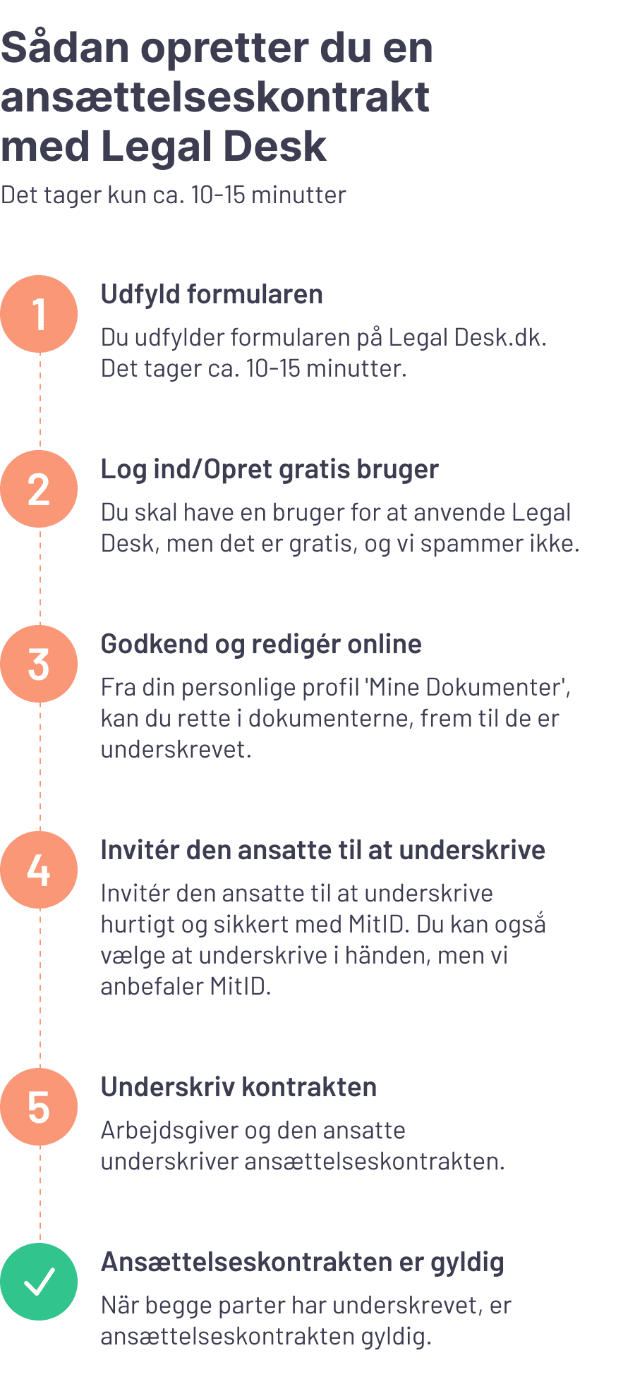 Når du udarbejder din ansættelseskontrakt med Legal Desk, modtager du ansættelseskontrakten straks efter, at du har udfyldt formularen på hjemmesiden. Herefter er kontrakten klar til at blive underskrevet af dig og din medarbejder, hvilket I nemt og hurtigt kan gøre digitalt med jeres MitID.