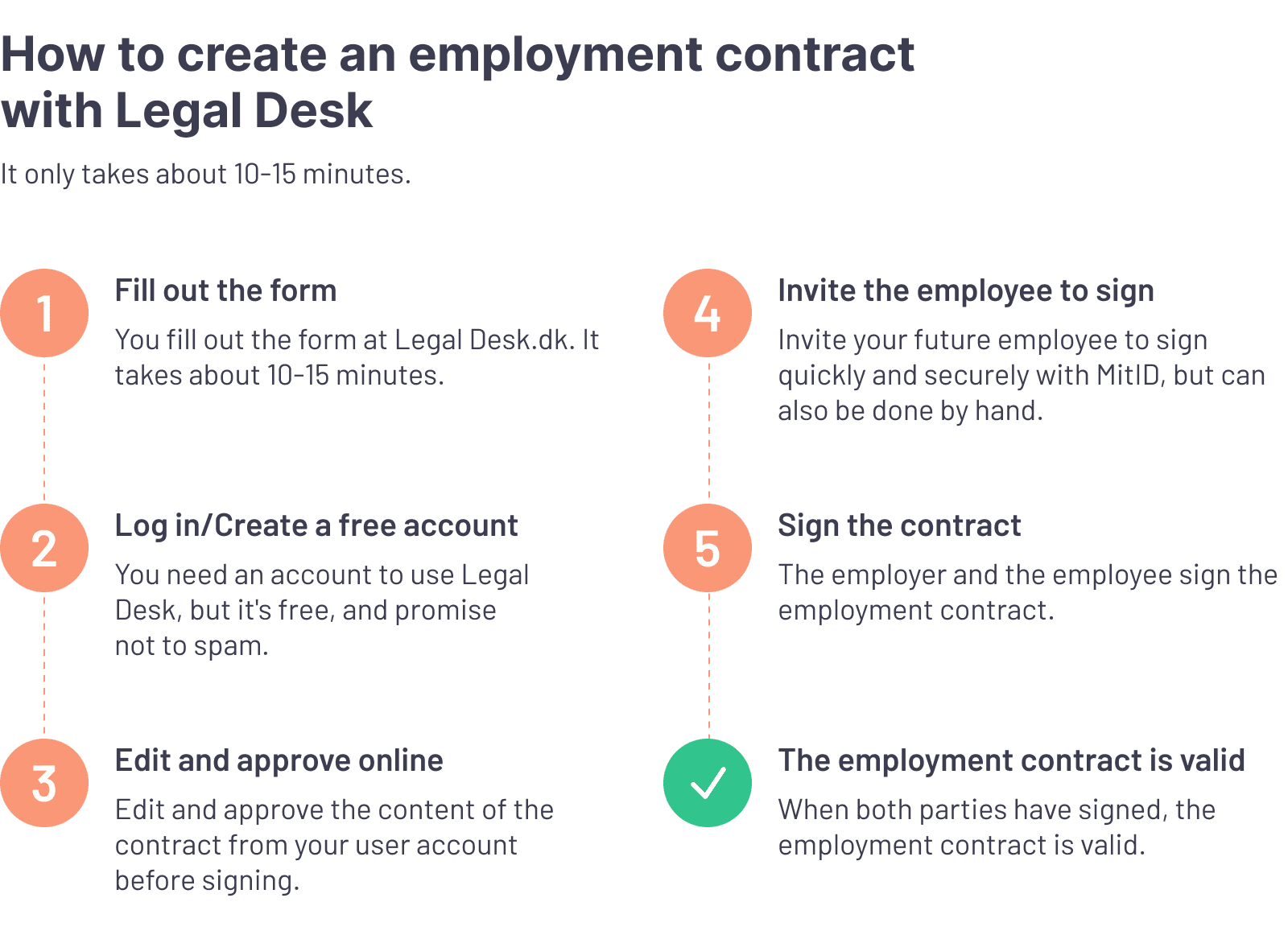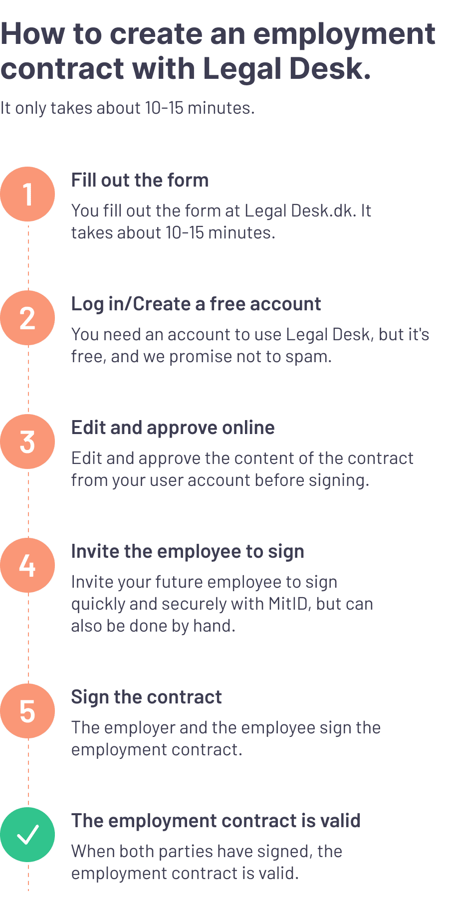 When you draw up your employment contract with Legal Desk, you will receive the employment contract immediately after you have filled out the form on our website. Hereafter the contract is ready to be signed by you and your employee, which you can easily and quickly do digitally with MitID (learn more about signing with MitID here).