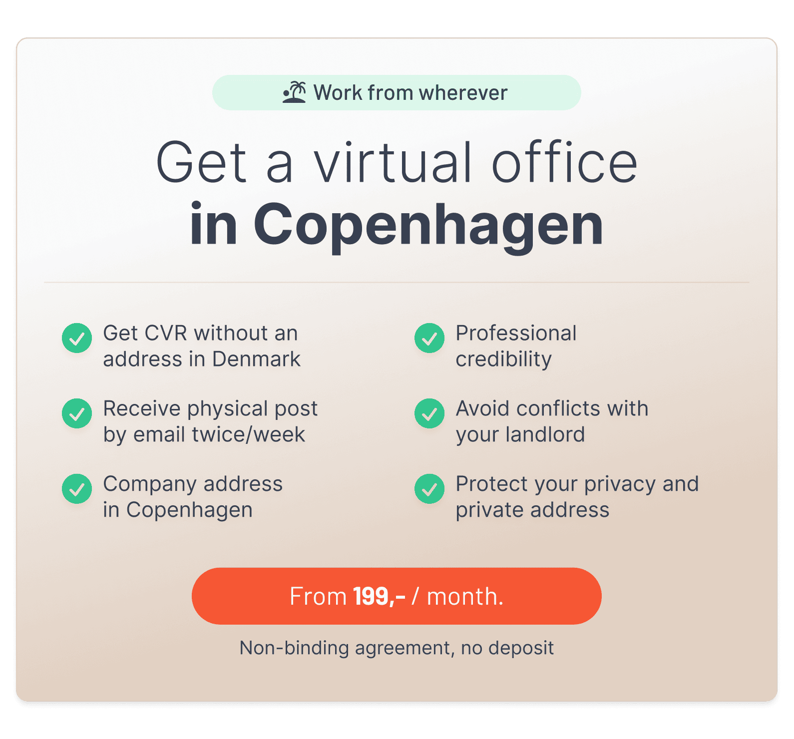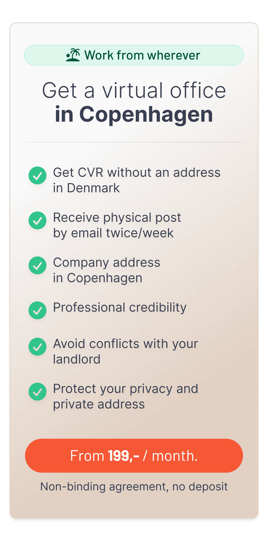 A virtual office gives you a Danish address without the need to maintain a physical location in Denmark.