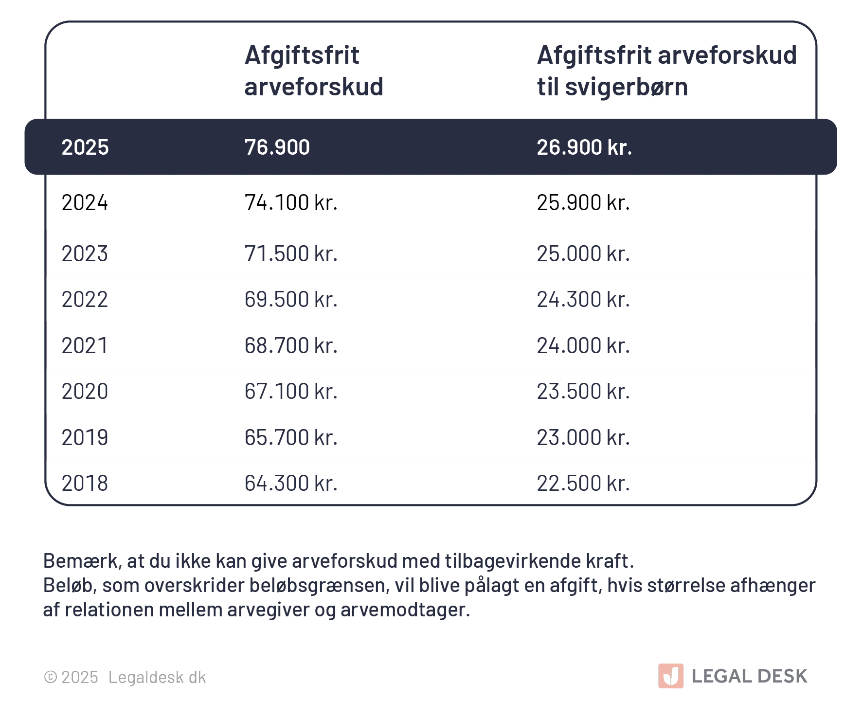 Det afgiftsfrie beløb for arveforskud til sine børn ligger som udgangspunkt på 80.600 kr. (2026). Beløbsgrænsen for det afgiftsfrie arveforskud til svigerbørn ligger dog på 28.200 kr. (2026).