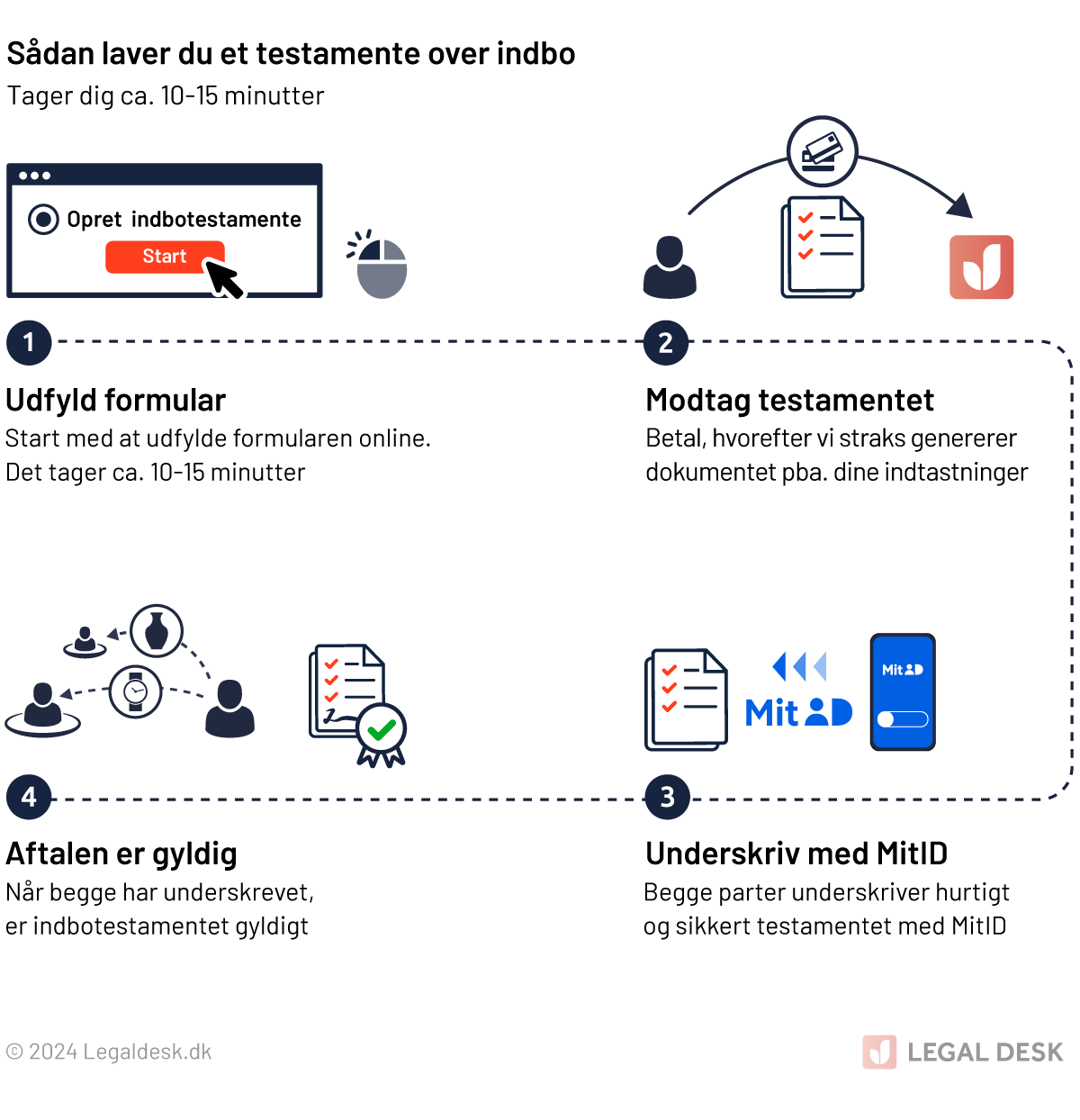 Når du har gennemført formularen og købt dit indbotestamente, får du straks adgang til dokumentet. Herefter skal det dateres og underskrives af dig (arvelader). Dit indbotestamente vil herefter være gyldigt. I modsætning til et generelt testamente, er der ikke noget krav om underskrift foran en notar eller andet, såsom tinglysning, vitterlighedsvidner, advokatassistance eller lignende.