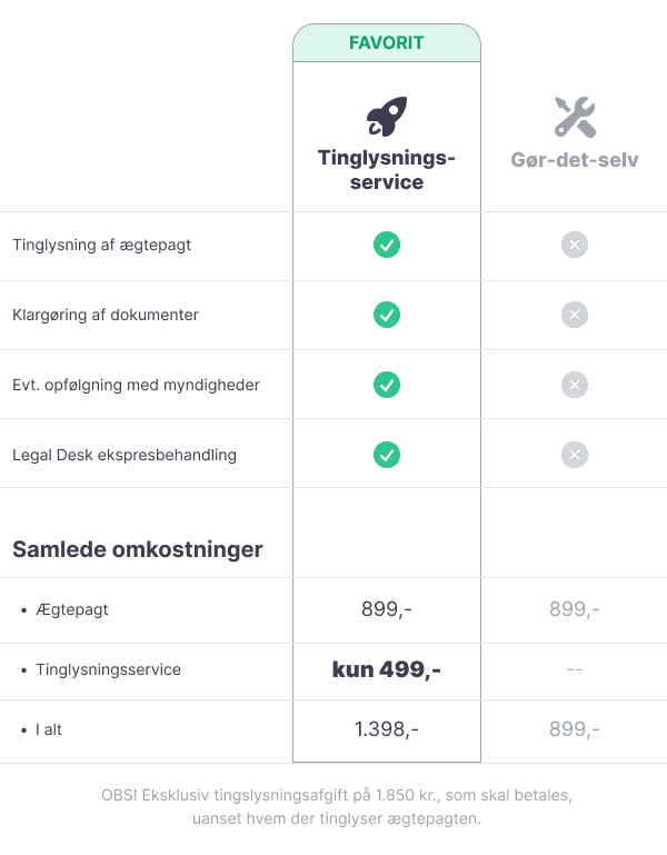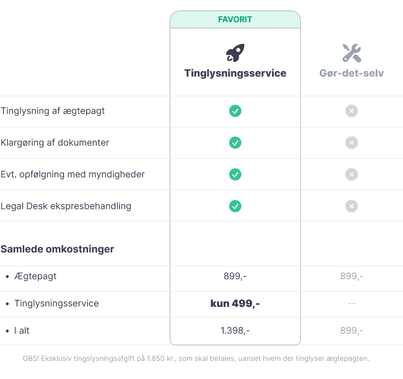 Ægtepagten skal underskrives af begge ægtefæller og tinglyses for at være gyldig. Det samme gælder, hvis i en dag ønsker at ændre i ægtepagten – her skal i oprette en ny ægtepagt og tinglyse denne.